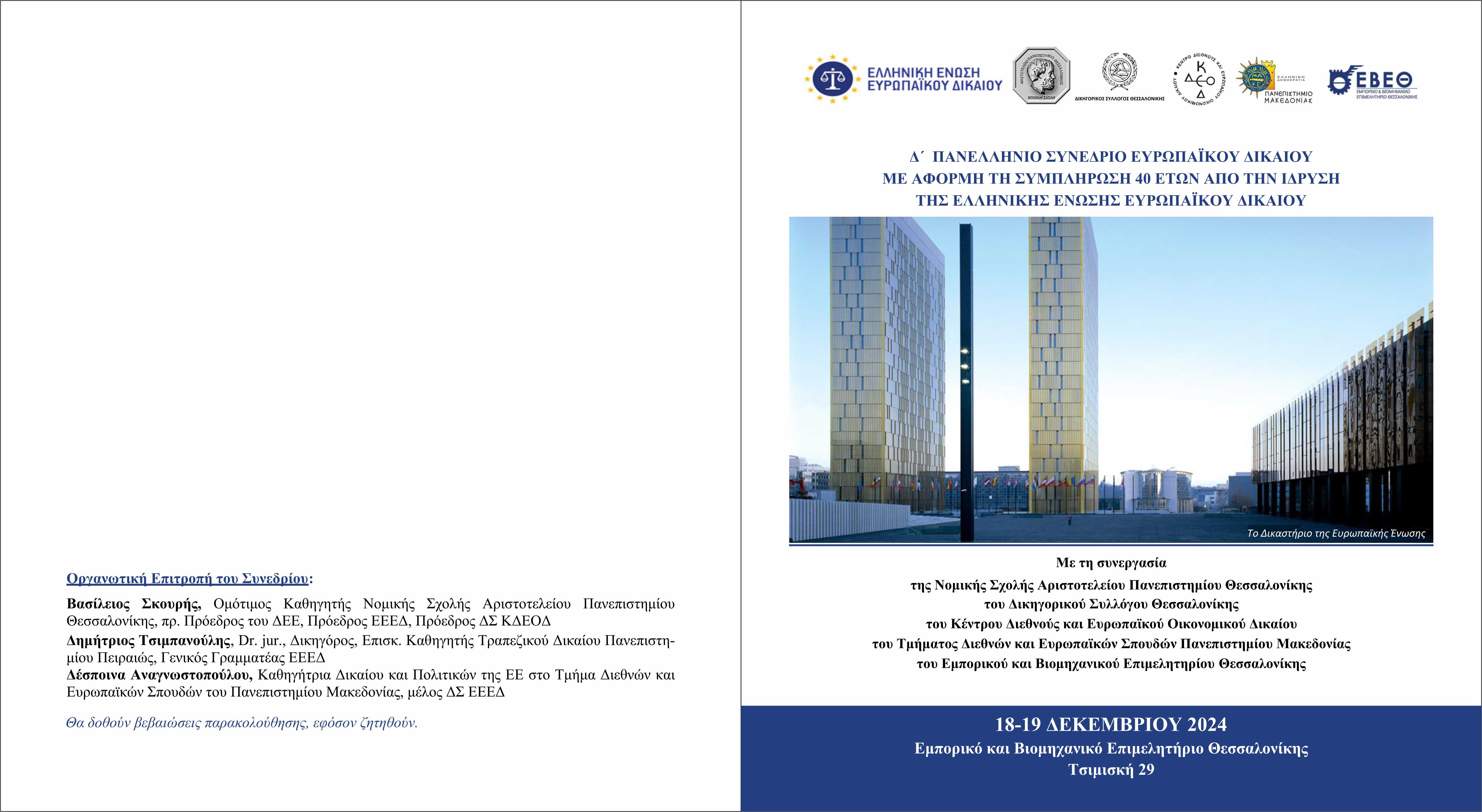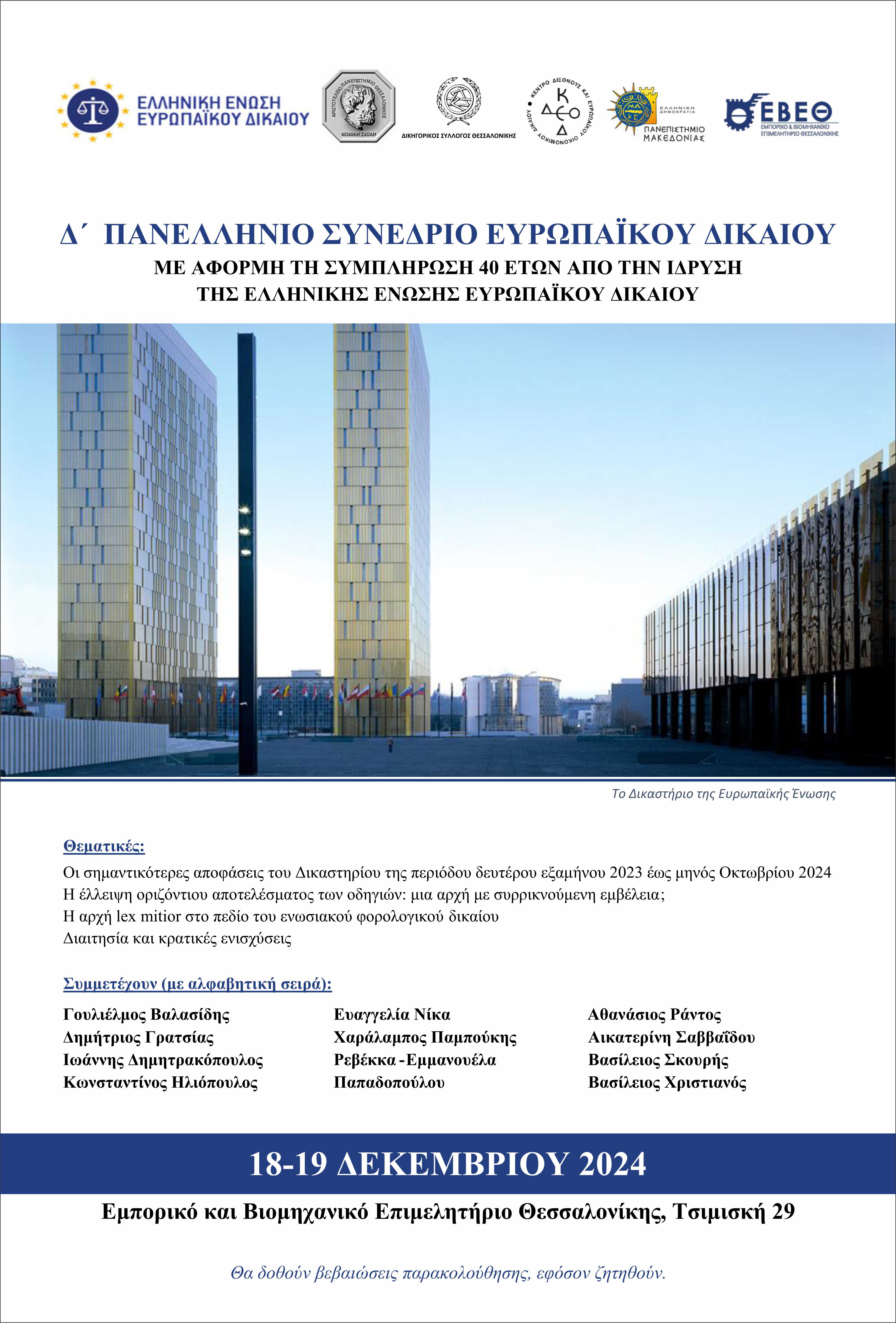 Το Δ΄ Πανελλήνιο Συνέδριο Ευρωπαϊκού Δικαίου διοργανώνει η Ελληνική Ένωση Ευρωπαϊκού Δικαίου με αφορμή τη συμπλήρωση 40 ετών λειτουργίας της, σε συνεργασία με τη Νομική Σχολή του Αριστοτελείου Πανεπιστημίου Θεσσαλονίκης, τον Δικηγορικό Σύλλογο Θεσσαλονίκης, το Κέντρο Διεθνούς και Ευρωπαϊκού Οικονομικού Δικαίου, το Τμήμα Διεθνών και Ευρωπαϊκών Σπουδών του Πανεπιστημίου Μακεδονίας και το Εμπορικό και Βιομηχανικό Επιμελητήριο Θεσσαλονίκης (ΕΒΕΘ).