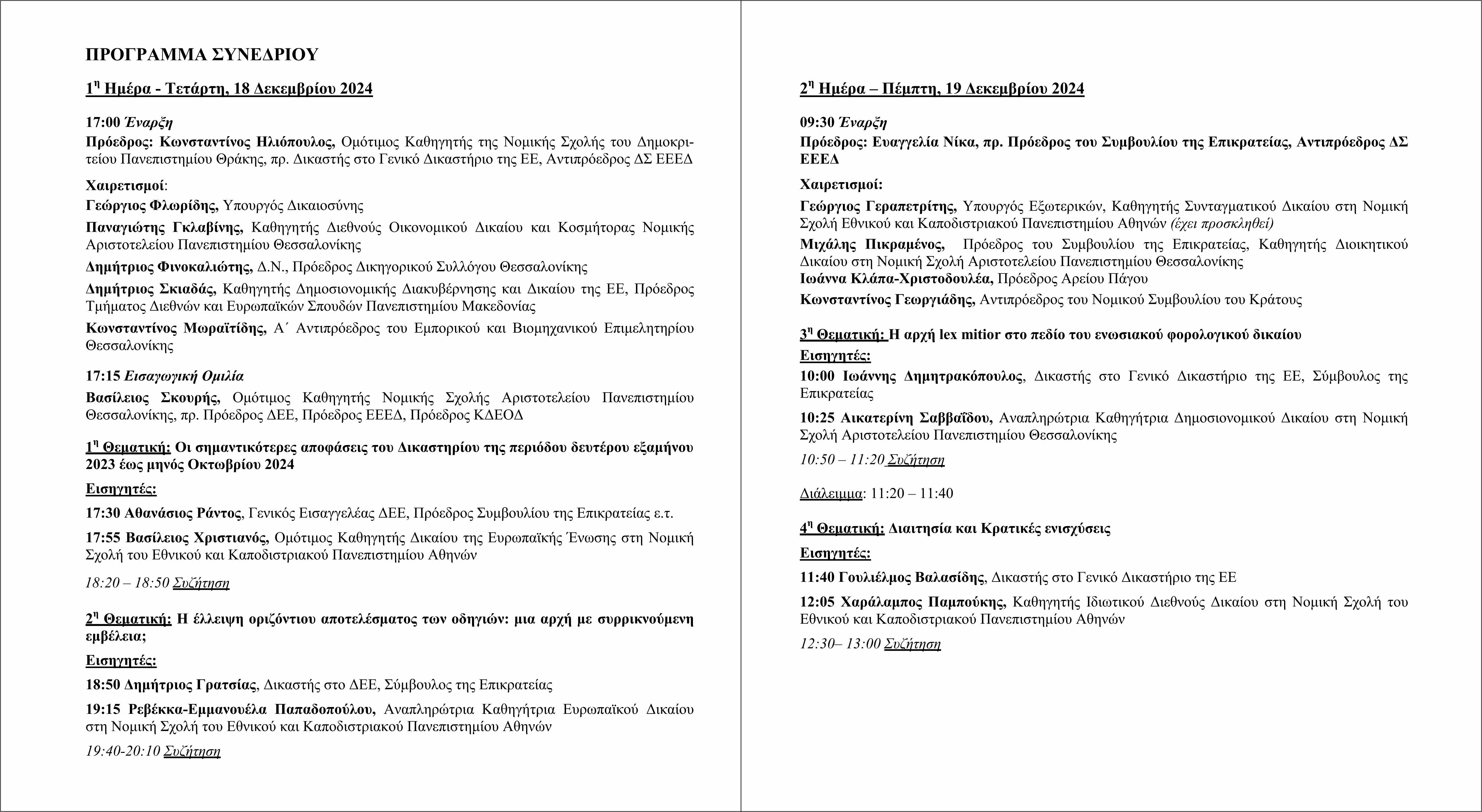 Το εν λόγω πανηγυρικό συνέδριο θα διεξαχθεί στη Θεσσαλονίκη την Τετάρτη 18 Δεκεμβρίου, ώρα 17:00-20:00, και την Πέμπτη 19 Δεκεμβρίου, ώρα 09:30-13:30, στο Εμπορικό και Βιομηχανικό Επιμελητήριο Θεσσαλονίκης (ΕΒΕΘ), οδός Τσιμισκή 29. Μεταξύ των θεματικών είναι ζητήματα ενωσιακού φορολογικού δικαίου, διαιτησίας και κρατικών ενισχύσεων.